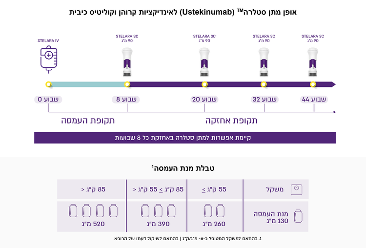 לאחר קבלת המנה ההתחלתית, תקבל את המנה הבאה של 90 מ"ג סטלרה בזריקה תת עורית לאחר 8 שבועות, וכל 12 שבועות לאחר מכן. לאחר קבלת הזריקה התת עורית הראשונה, חלק מהמטופלים ייתכן ויקבלו סטלרה 90 מ"ג כל 8 שבועות. הרופא שלך יחליט מתי עליך לקבל את הזריקה הבאה שלך.